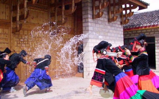 男方的接亲队伍来到女方家的时候,女方家族会用泼水的形式来表示欢迎和庆祝。彝族人认为泼水后,女孩嫁到男方家就不用去远地挑水,即使干旱的季节也可以不愁吃喝。