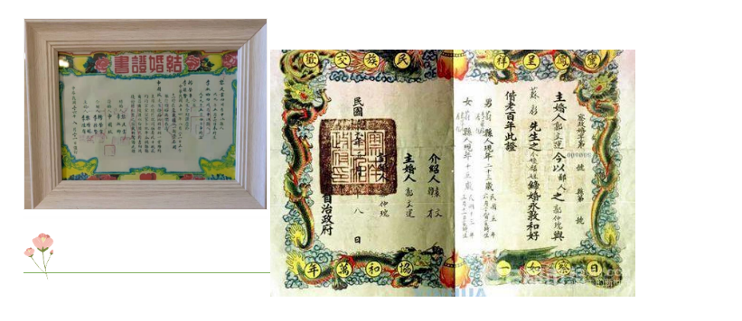 民国时期的婚书了既沿用了古代常用的龙凤、神祇,也有一些新的元素出现。仙女在中国神话中总是代表着对理想爱情的追寻,像牛郎与织女、后裔与嫦娥的故事总是经久不衰。 在民国时期的婚书中,仙女以送子娘娘的形象出现。下图上的仙女们有的手抱童子,有的手持莲花。莲花与果实莲蓬是同时生长,也暗含生育特征,婚书四周又用莲花点缀,以此借喻“早生贵子”。